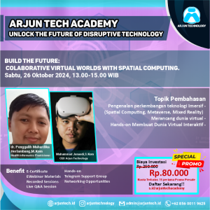 Jelajahi teknologi Spatial Computing dan ciptakan dunia virtual kolaboratif yang futuristik! Di webinar ini, Anda akan belajar bagaimana membangun ruang virtual yang bisa digunakan untuk simulasi, kolaborasi, dan pengembangan dalam berbagai bidang seperti pendidikan dan kesehatan.