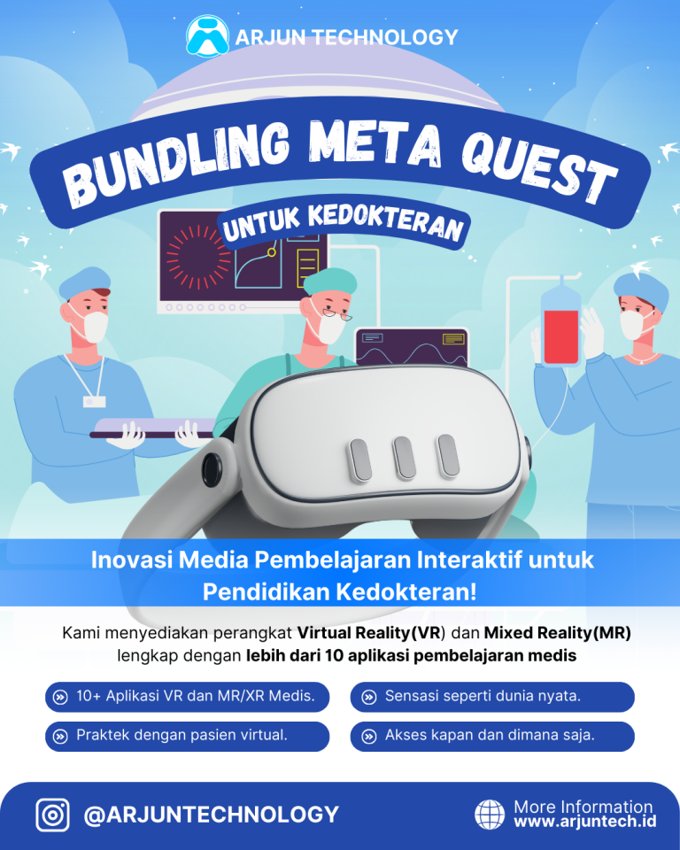 Untuk mendukung transformasi ini, Arjun Technology menghadirkan Paket Bundling Meta Quest untuk Kedokteran! Dengan paket ini, Anda bisa mendapatkan headset VR Meta Quest lengkap dengan 10+ aplikasi pembelajaran medis terbaik yang siap digunakan.