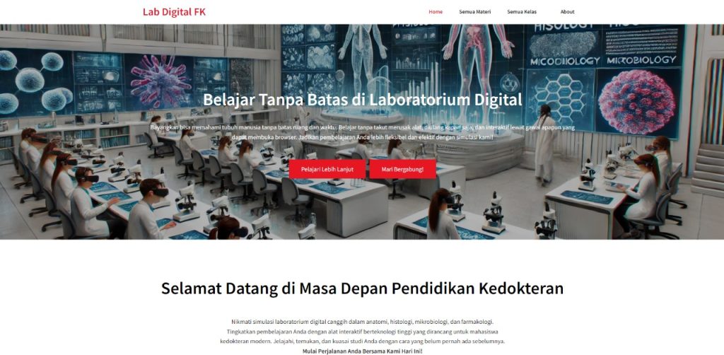 Lab Digital FK adalah platform web interaktif yang dirancang khusus untuk mahasiswa fakultas kedokteran. Platform ini menyediakan akses mudah ke berbagai materi kuliah, memungkinkan mahasiswa untuk belajar secara mandiri dan terstruktur. Di dalam Lab Digital FK, mahasiswa dapat mengakses berbagai kelas yang dilengkapi dengan materi kuliah komprehensif, kuis untuk menguji pemahaman, dan tampilan 3D objek anatomi untuk pemahaman visual yang lebih baik. Dengan fitur-fitur ini, Lab Digital FK memfasilitasi pengalaman belajar yang lebih mendalam dan interaktif. Mahasiswa dapat mempelajari materi kuliah dengan cara yang lebih menarik, berlatih dengan kuis, dan mengeksplorasi struktur anatomi secara tiga dimensi, meningkatkan pemahaman mereka terhadap topik-topik medis yang kompleks.